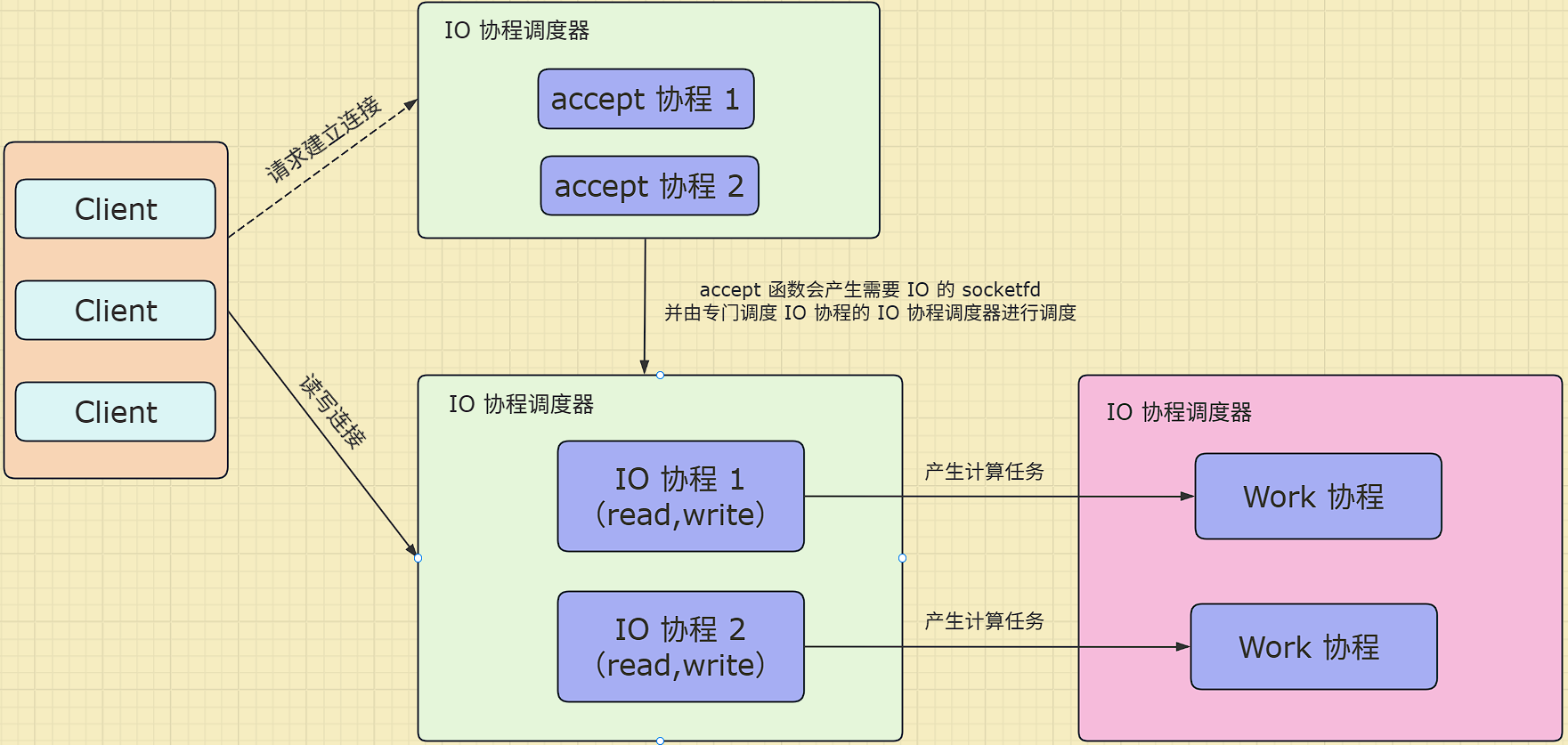 Accept调度器: 专注于监听(listen)与接收(accept)。只负责捕获新连接,确保即使在高负载下,新用户的接入响应依然迅速。IO调度器: 专注于具体的业务逻辑(Handle)。一旦连接建立,任务会被立即 “派发” 给IO调度器,从而避免了耗时的业务计算阻塞后续连接的接入。