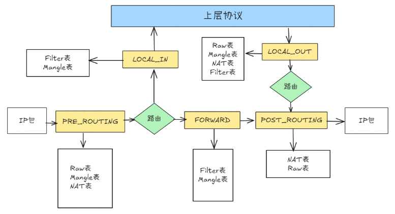 PREROUTING:数据包进入路由表之前INPUT:通过路由表后目的地为本机FORWARD:通过路由表后,目的地不为本机OUTPUT:由本机产生,向外发送POSTROUTIONG:发送到网卡接口之前。