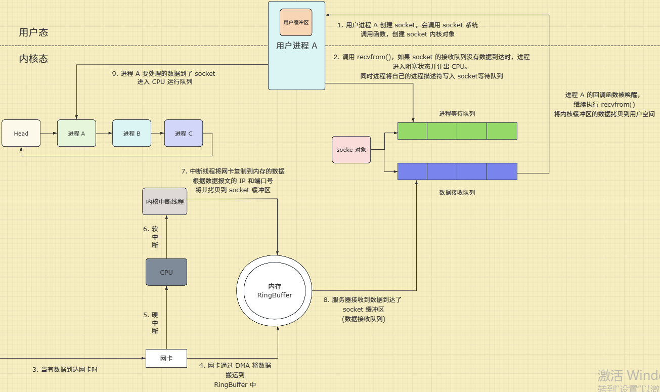 • 内核中断进程 根据 socket接收队列 的数据,通过 等待队列 中的回调函数,唤醒要处理该数据的进程 A,此时进程 A 进入到 CPU 的运行队列,等待 CPU 的调度。